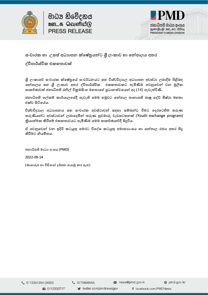 රී ලංකාව අතර ද්විපාර්ශ්වි ක එකඟතාවකට පැමිණීම වෙනුවෙන් වන මූලික සාකච්ඡාවක් ජනාධිපති රනිල් වික්රමසිංහ මහතාගේ ප්රධානත්වයෙන් අද (14) පැවැත්විණි. ජනාධිපති ලේකම් කාර්යාලයේදී පැවැති මෙම හමුවට නේන්තාල තානාපති බාපු දේව් මිත්රා මහතා එක්ව සිටියේය. විශ්වවිද්යාල අධ්යාපනය සහ සංචාරක අවස්ථාවන් සඳහා සම්බන්ධ වීමට දෙරටෙහිම තරුණ තරුණියන්ට අවස්ථාවන් ලබාදෙමින් තරුණ හුවමාරු වැඩසටහනක් (Youth exchange program) ක්රියාත්මක කිරීමේ එකඟතාවයට පැමිණීම මෙම සාකච්ඡාවේදී සිදුවිය. ඒ වෙනුවෙන් වන ඉදිරි කටයුතු මෙරට විදේශ කටයුතු අමාත්යාංශය හා නේපාල රජය අතර සිදු කිරීමට නියමිතය.